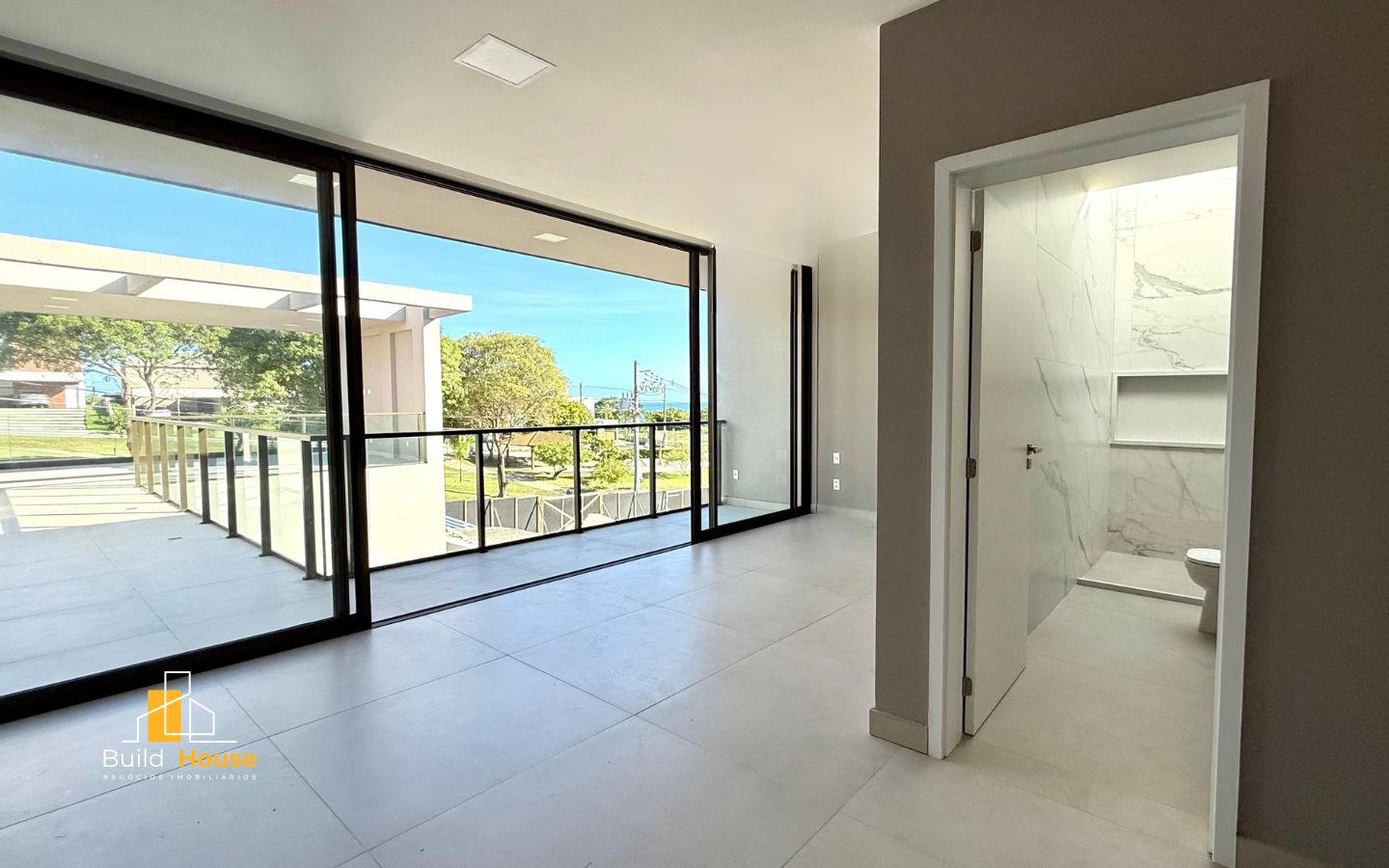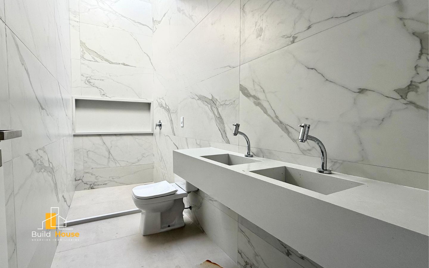 • Suíte master com revestimento Carrara 60×120
